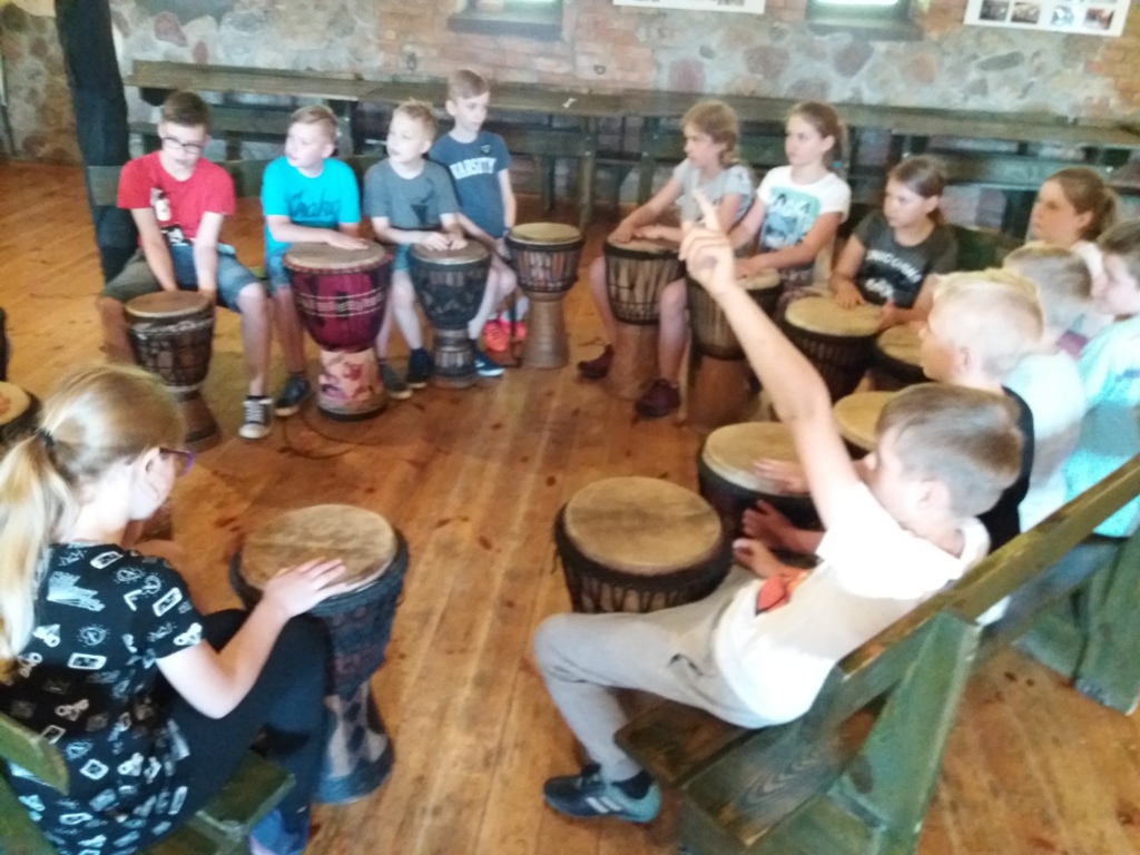 Uczniowie uczestniczyli w różnorodnych warsztatach: bębniarskich, szczudlarskich, garncarskich,