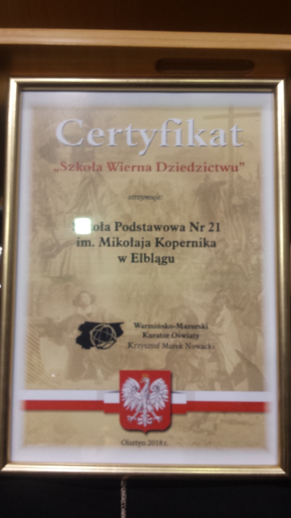 W tę wyjątkową rocznicę, bo stulecia odzyskania przez Polskę niepodległości , nasza szkoła zdobyła prestiżowy certyfikat Szkoła Wierna Dziedzictwu.