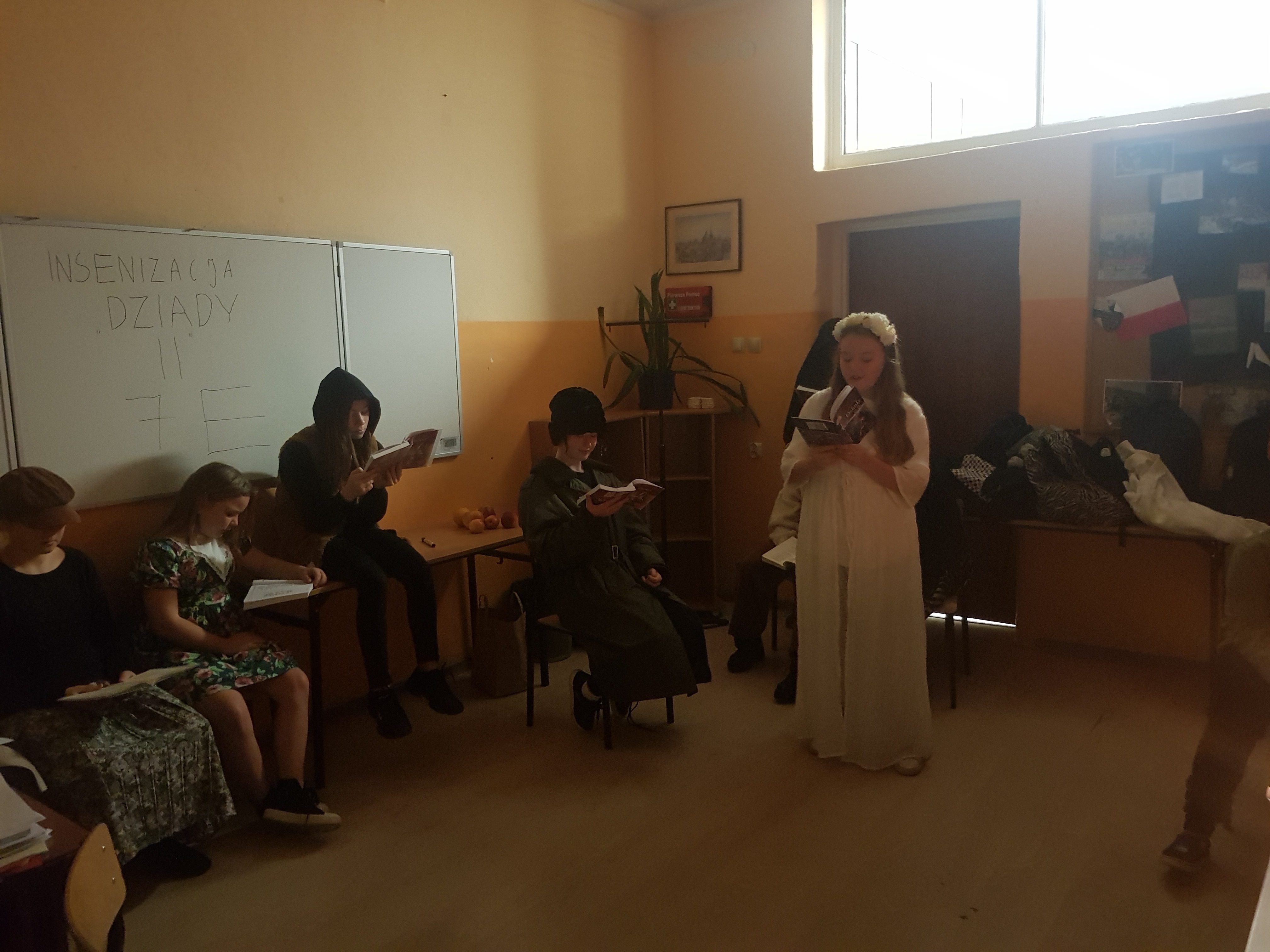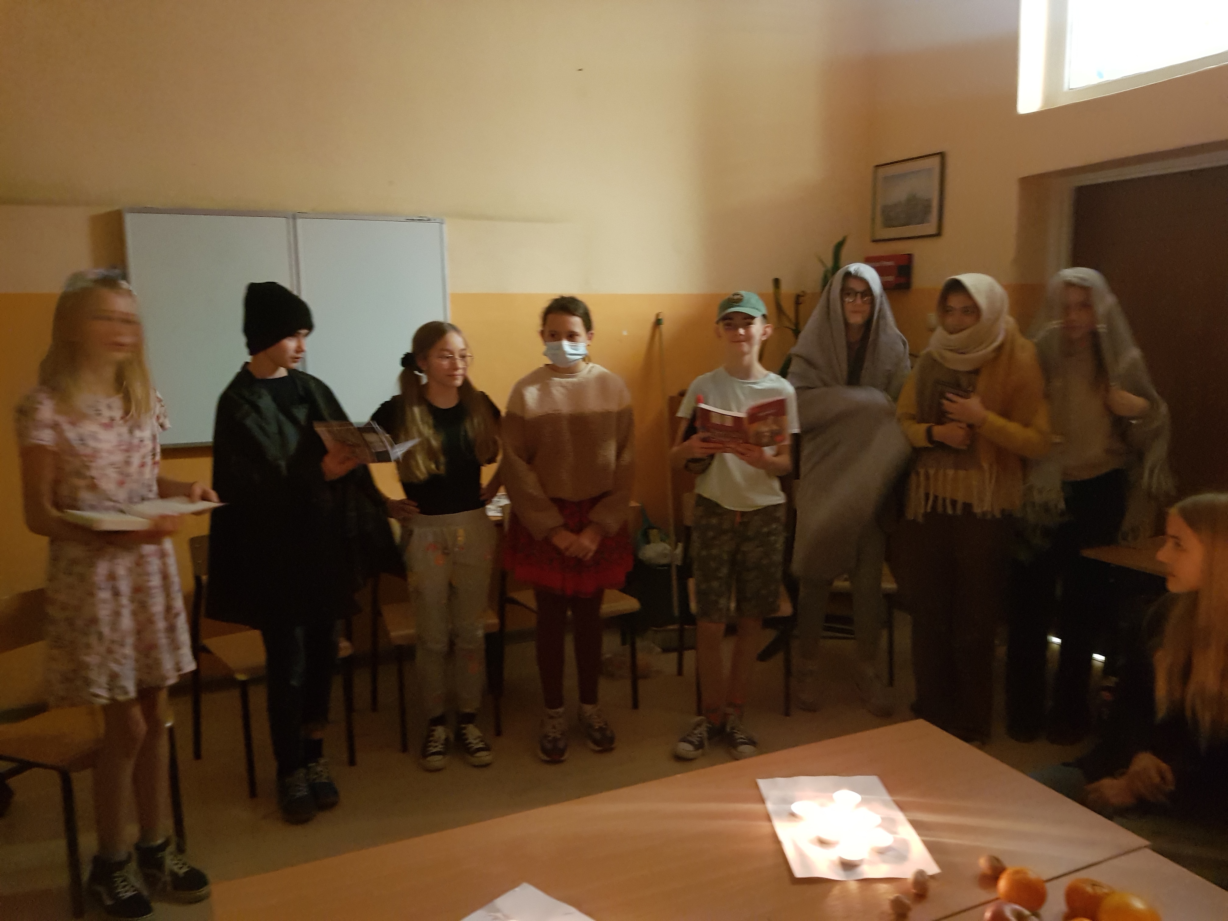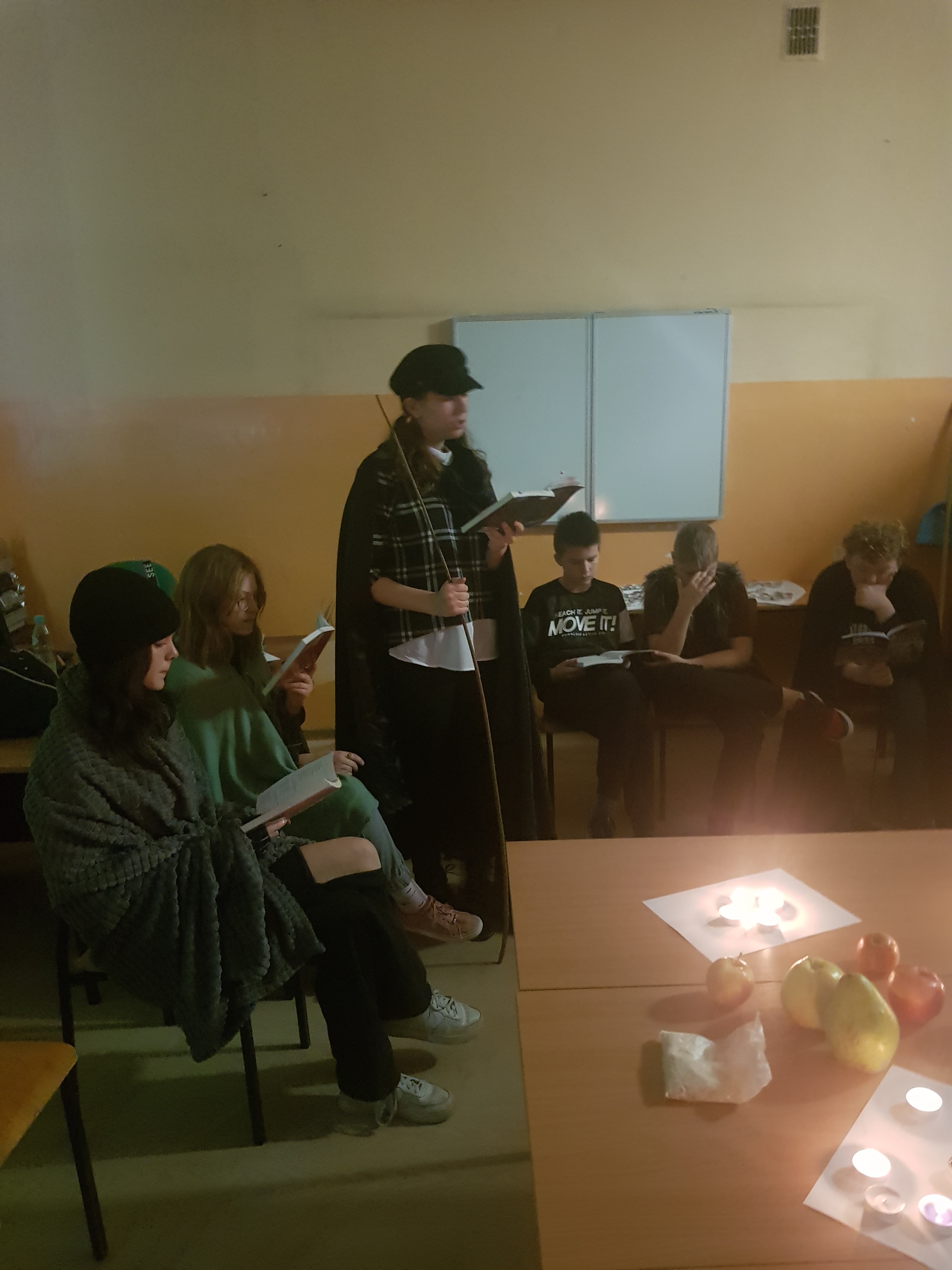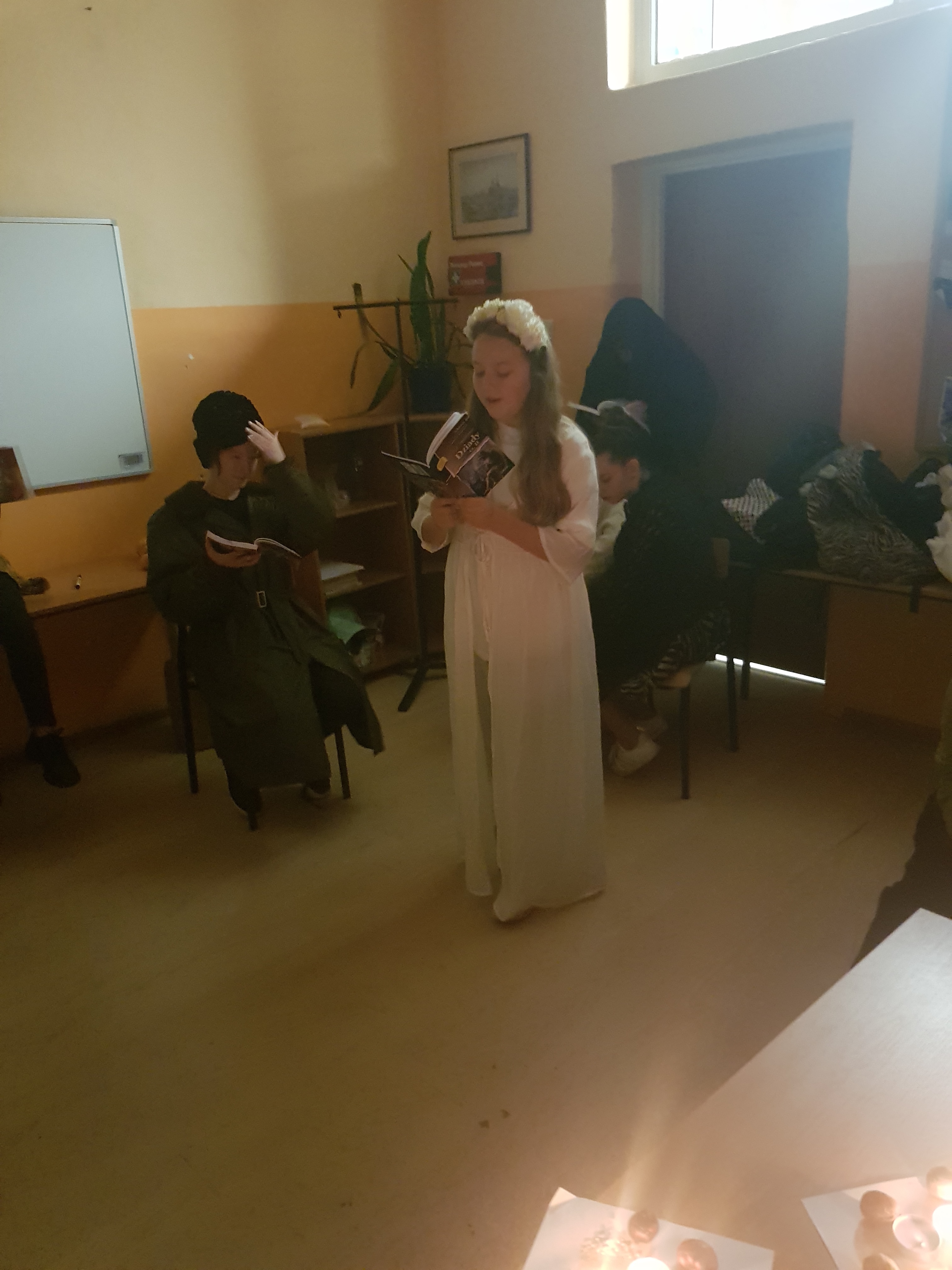 To były niezwykle klimatyczne lekcje języka polskiego. W atmosferze Zaduszek klasy: 7a, 7b, 7e, 7f z rozmachem i wielkim zaangażowaniem wystawiły ” Dziady” Adama Mickiewicza. Przedstawienie obfitowało w piękną recytację dramatu naszego wieszcza, a stroje i bogaty stół dopełniły całości tego magicznego spotkania. Kochani Uczniowie, naprawdę jestem z Was dumna. Pokazaliście, że jesteście: twórczy, pomysłowi, wrażliwi. Brawo!!!