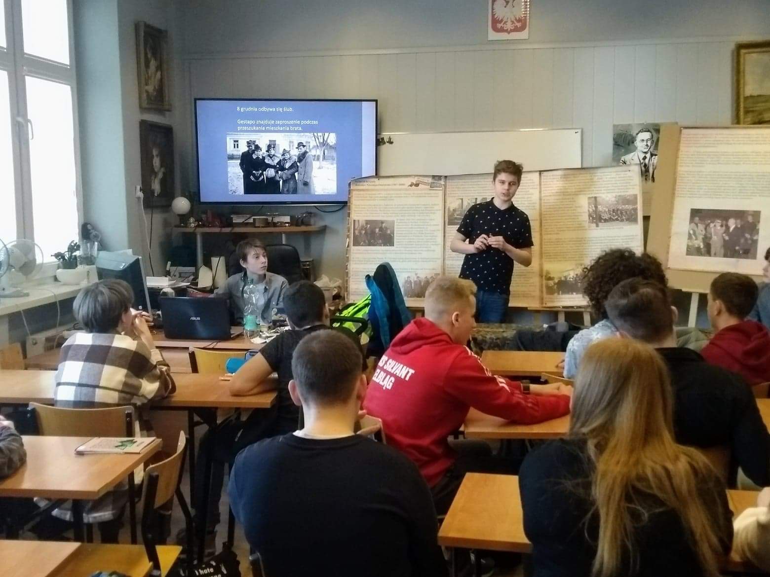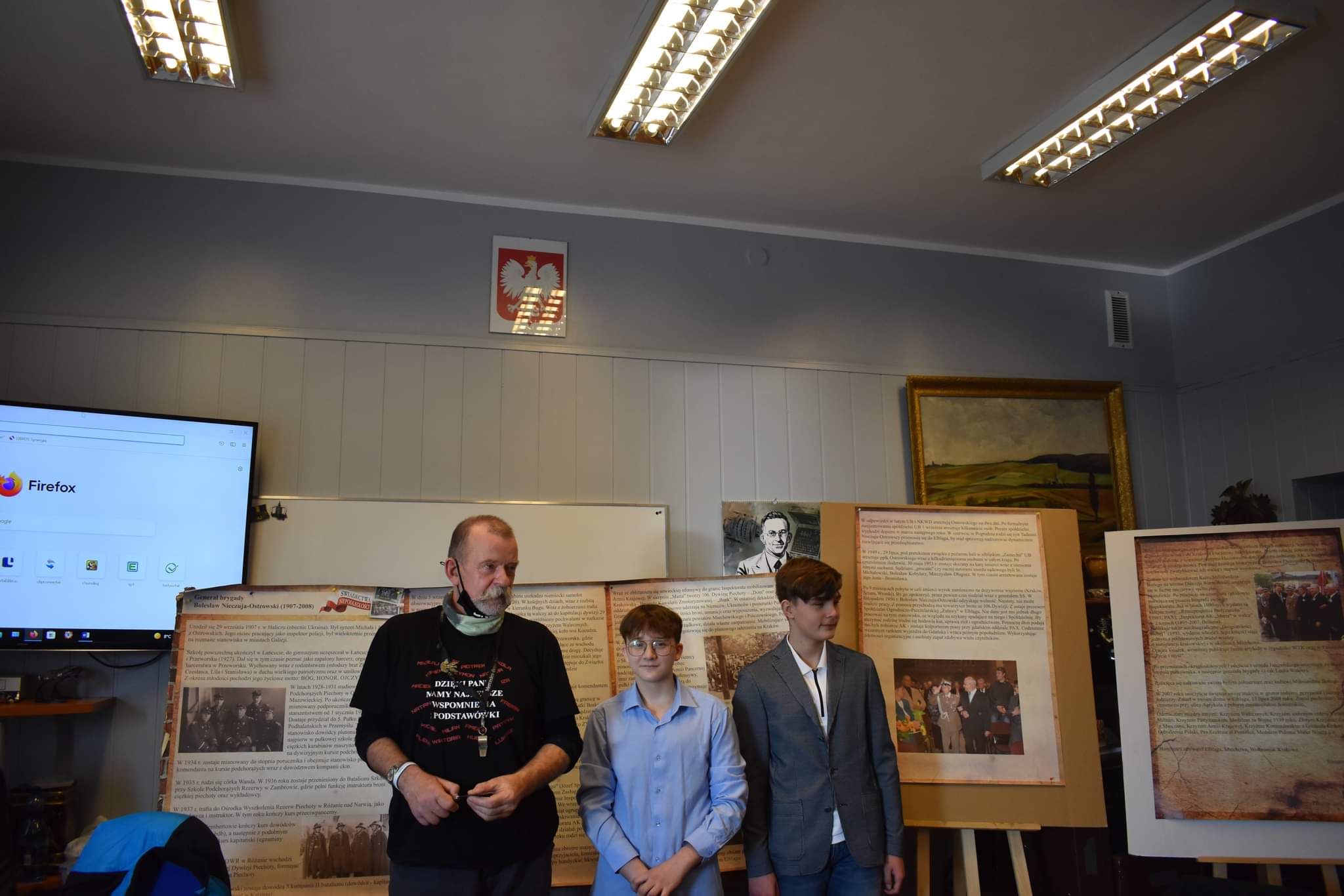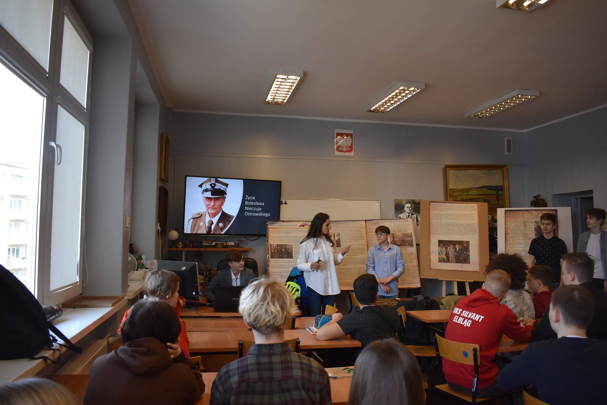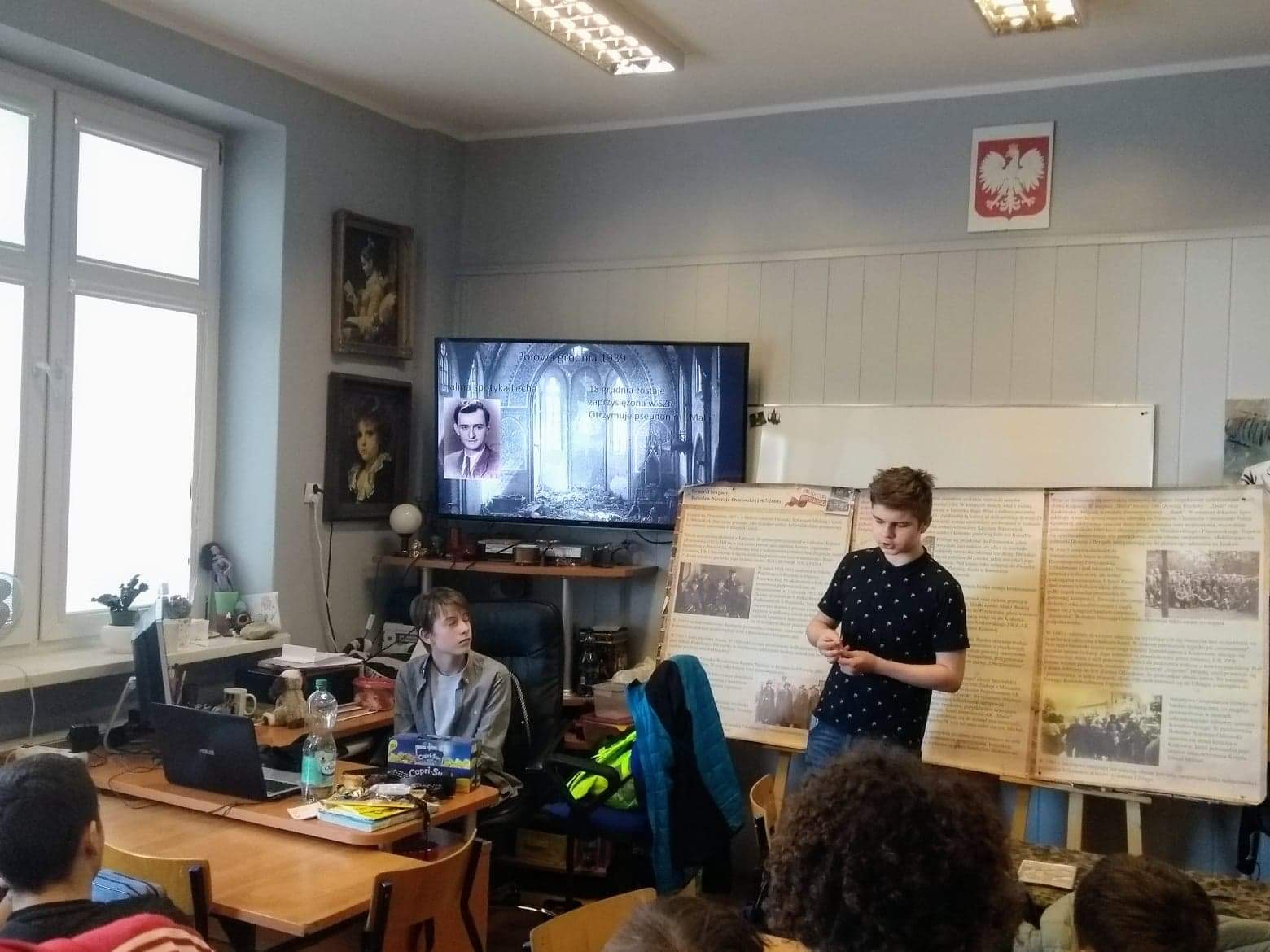 W trakcie wizyty chłopcy zaprezentowali uczniom klasy ósmej sylwetki dwójki bohaterów polskiego podziemia niepodległościowego: generała Bolesława Nieczuja – Ostrowskiego, utytułowanego bohatera walk września 1939 i dowódcy wielkich jednostek AK oraz Haliny Rajewskiej –Wittg, działaczki AK, która została aresztowana przez gestapo na własnym weselu. Pan Wojciech Paczkowski nauczyciel historii w SP nr 1 przygotował wystawę poświęconą panu generałowi, prezentującą plansze informacyjne i zdjęcia. Bardzo dziękujemy za ciepłe przyjęcie. Do następnego spotkania!