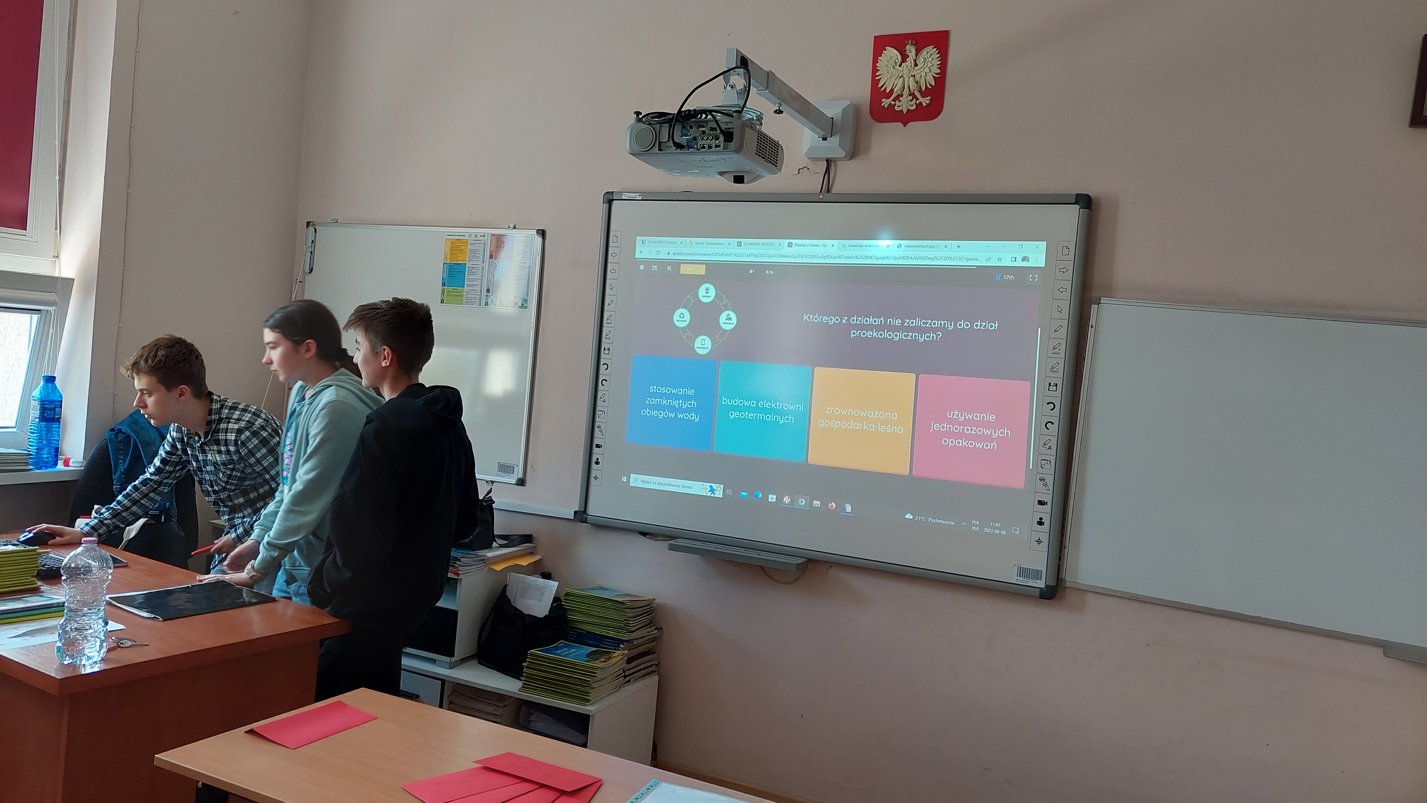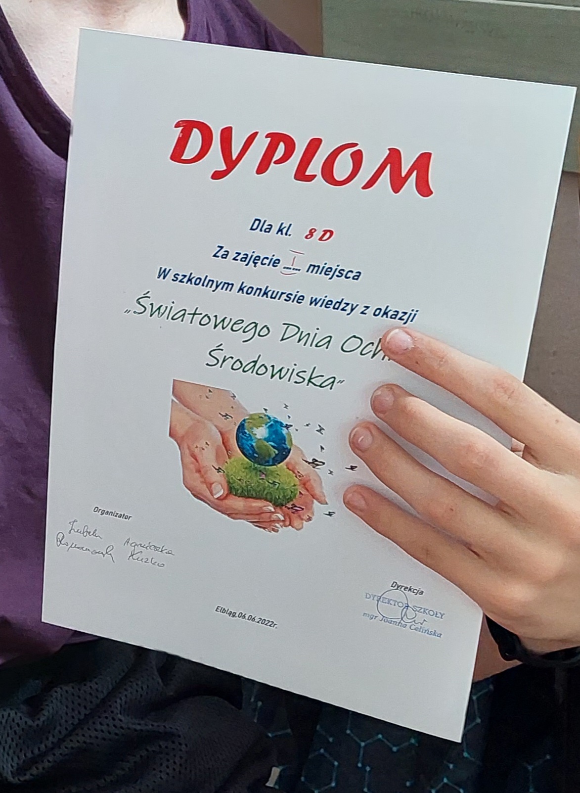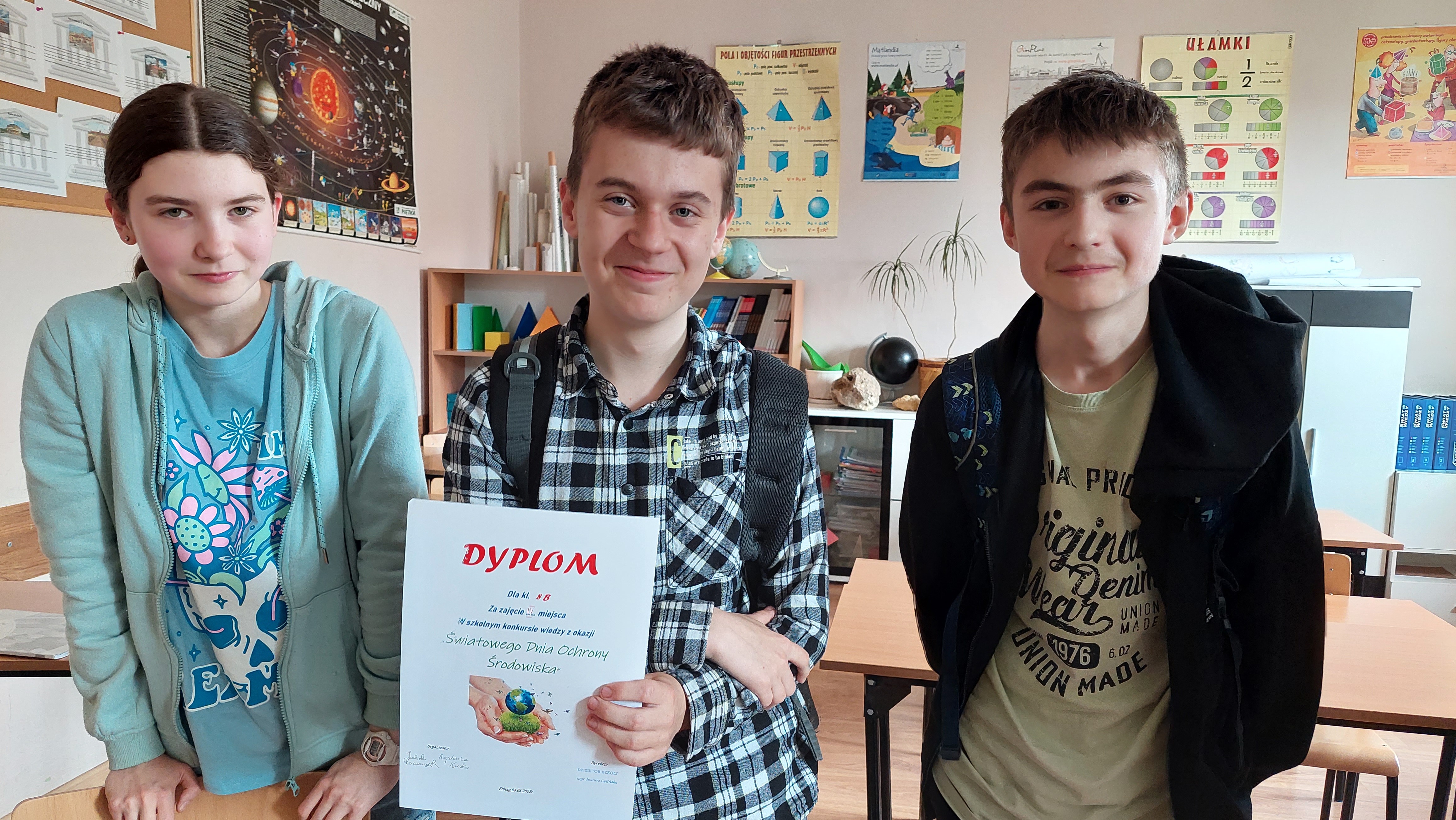 5 czerwca przypada Światowy Dzień Ochrony Środowiska. Z tej okazji 6 czerwca w naszej szkole odbył się konkurs wiedzy dla klas ósmych przygotowany  przez p. Izabelę Romanowska i p. Agnieszkę Kuzko. W konkursie wzięły udział klasy 8a, 8b, 8d i 8e reprezentowane przez trzyosobowe zespoły. Konkurs składał się z pięciu konkurencji. Rozpoczął się   od  quizu z ogólnej wiedzy o ochronie środowiska i światowych parkach narodowych. Następnie uczniowie wykazywali się wiedzą na temat polskich parków narodowych oraz parków krajobrazowych występujących na terenie województwa warmińsko- mazurskiego. Ponadto rozpoznawali rośliny i zwierzęta chronione w Polsce występujące na Warmii i Mazurach. ( Niemałym zaskoczeniem okazał się ryś euroazjatycki !)  J Ostatnie zadanie polegało na ułożeniu ciągów przyczynowo – skutkowych dotyczących zjawisk związanych z globalnym ociepleniem, smogiem, zjawiskiem eutrofizacji i powstawaniem kwaśnych mgieł i opadów.  Uczniowie wykazali się rozległą  wiedzą, Z większością zadań świetnie sobie poradzili. W powietrzu cały czas można było wyczuć unoszącego się ducha walki : )  Po tych potyczkach ostatecznie zwyciężył zespół kl. 8d, drugie miejsce zajął zespół kl. 8a, trzecie – 8e i czwarte – 8b. Uczniowie otrzymali piękne dyplomy  upamiętniające konkurs oraz dodatkowo zostaną nagrodzeni.