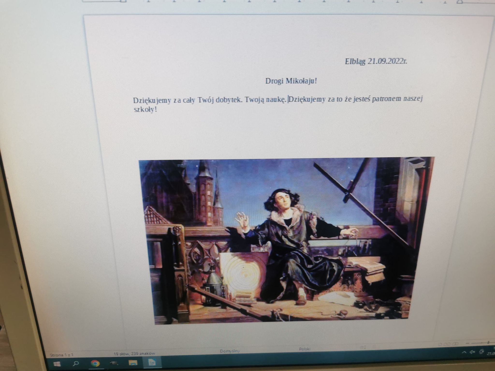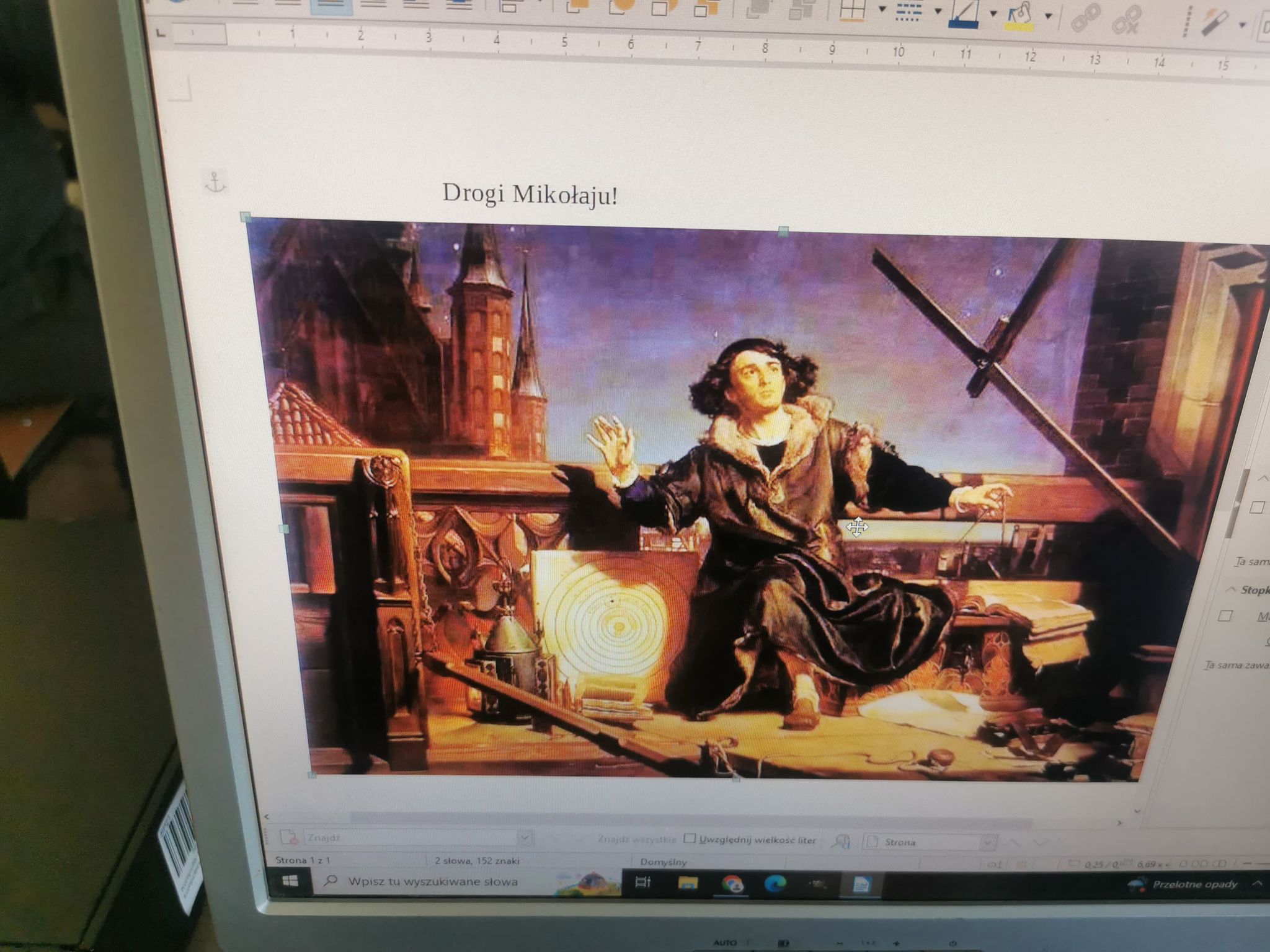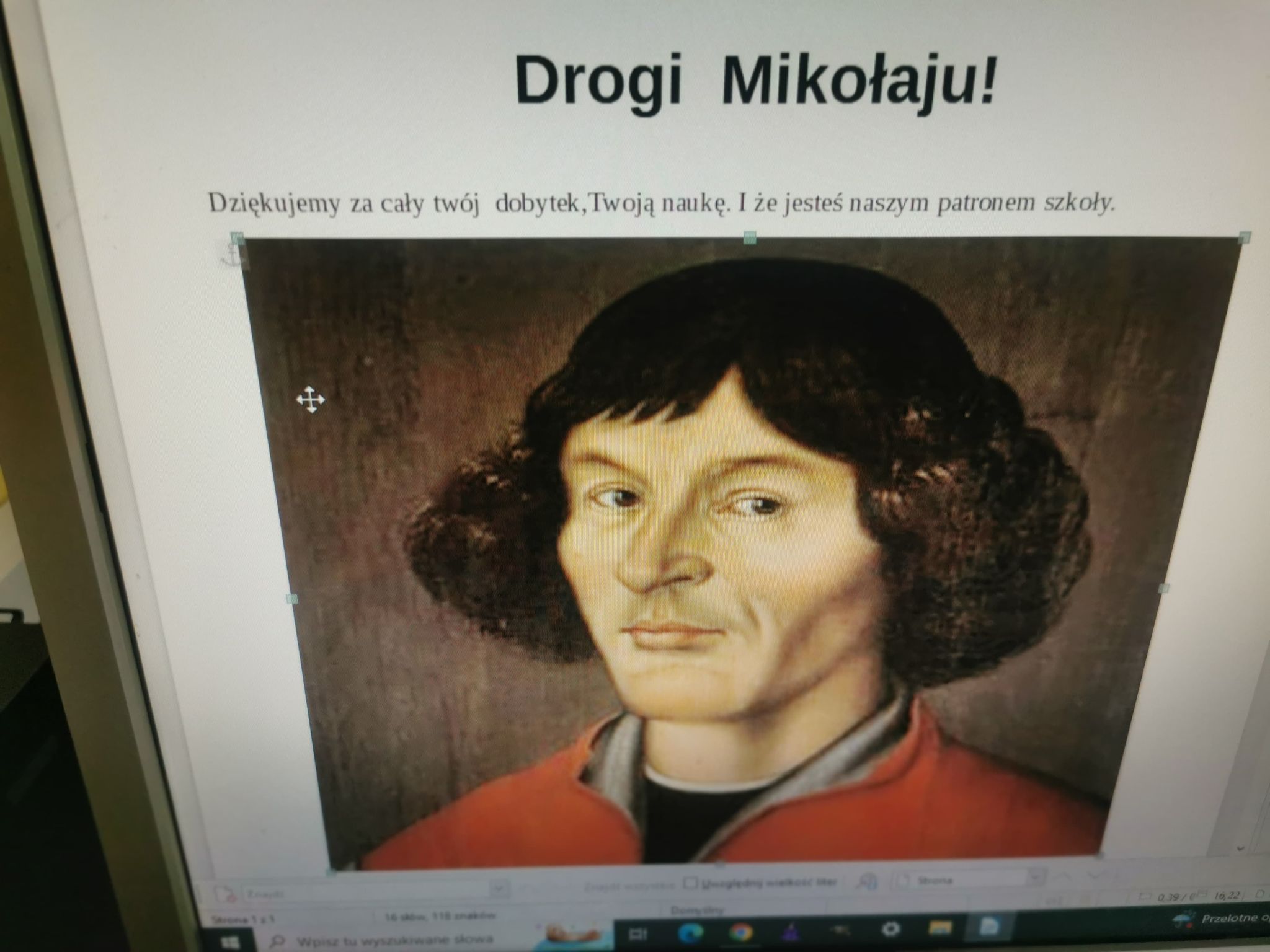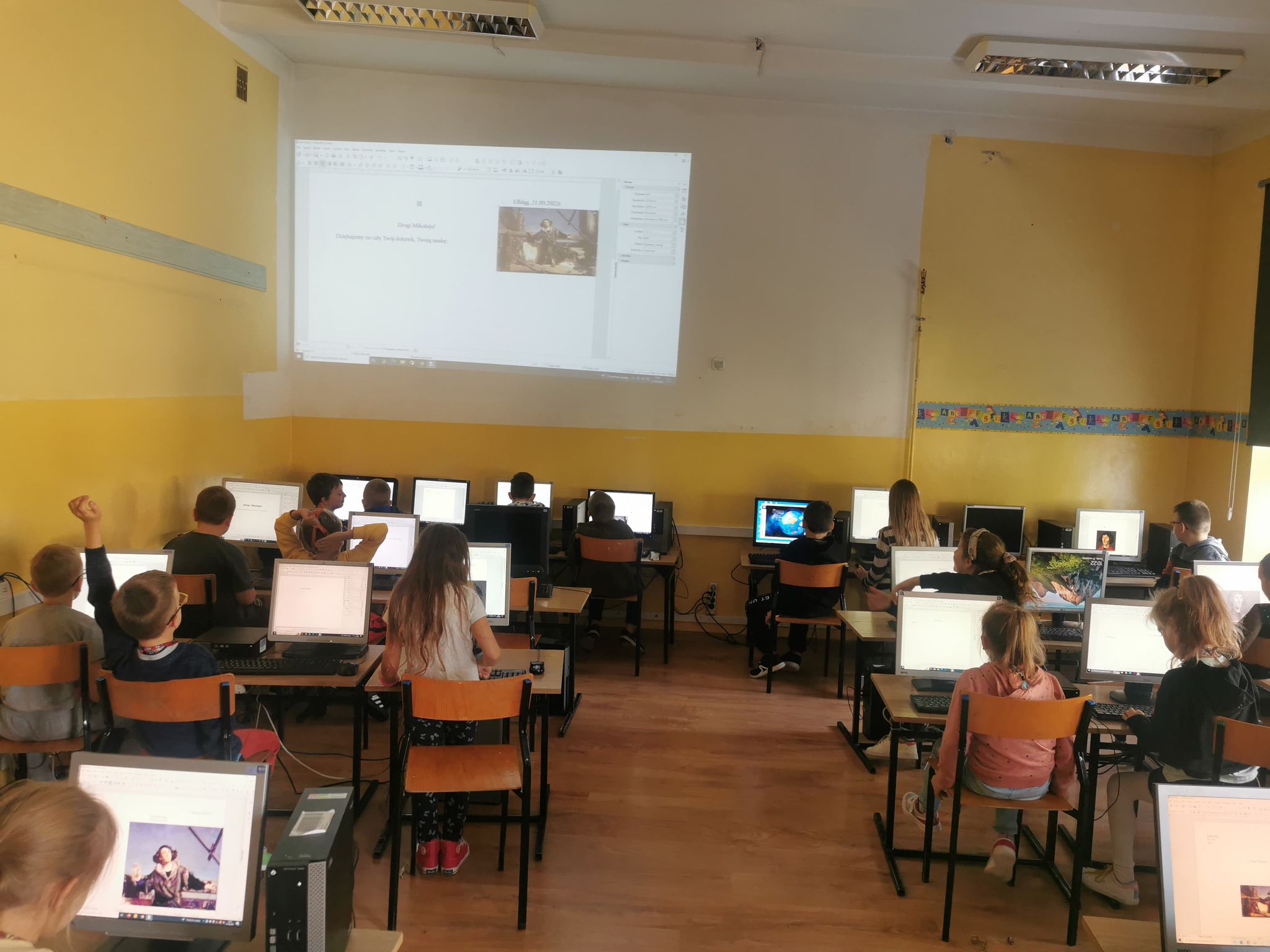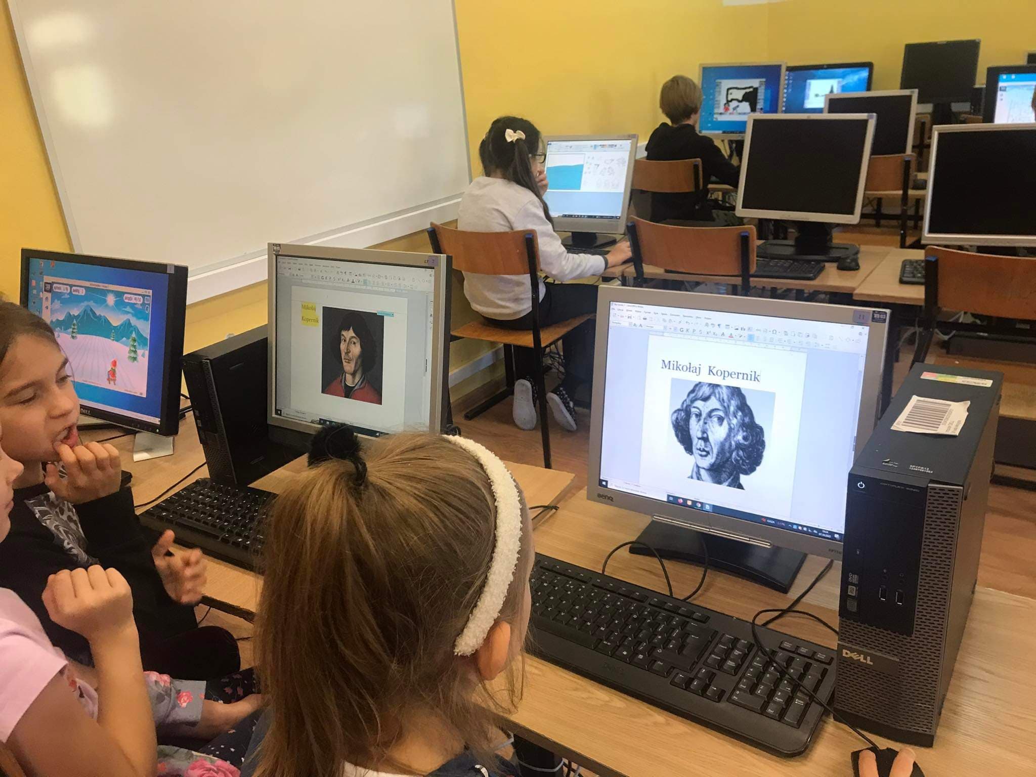 W celu poszerzenia wiedzy o patronie naszej szkoły- Mikołaju Koperniku, uczniowie klasy 2c i 2b zaznajomili się z owocami pracy astronoma, jego pasją i zamiłowaniem. Na zajęciach komputerowych, w związku ze zbliżającymi się urodzinami Mikołaja Kopernika, tworzyli jego portret i pisali listy z podziękowaniami.
