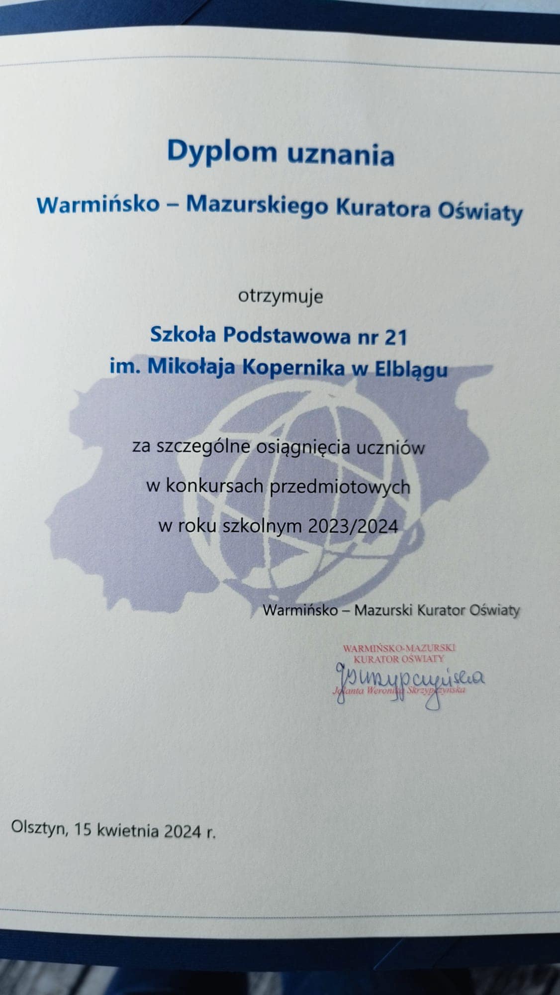 Dziś Pani Dyrektor Joanna Celińska odebrała z rąk Pani Kurator Oświaty dyplom uznania za szczególne osiągnięcia w konkursach przedmiotowych. Jesteśmy dumni, że zajęliśmy 2 miejsce w Złotej Dziesiątce najlepszych szkół w Elblągu a 3 miejsce w województwie warmińsko-mazurskim. Pani Dyrektor towarzyszyli nasi laureaci: Aleks i Michał Górniak.