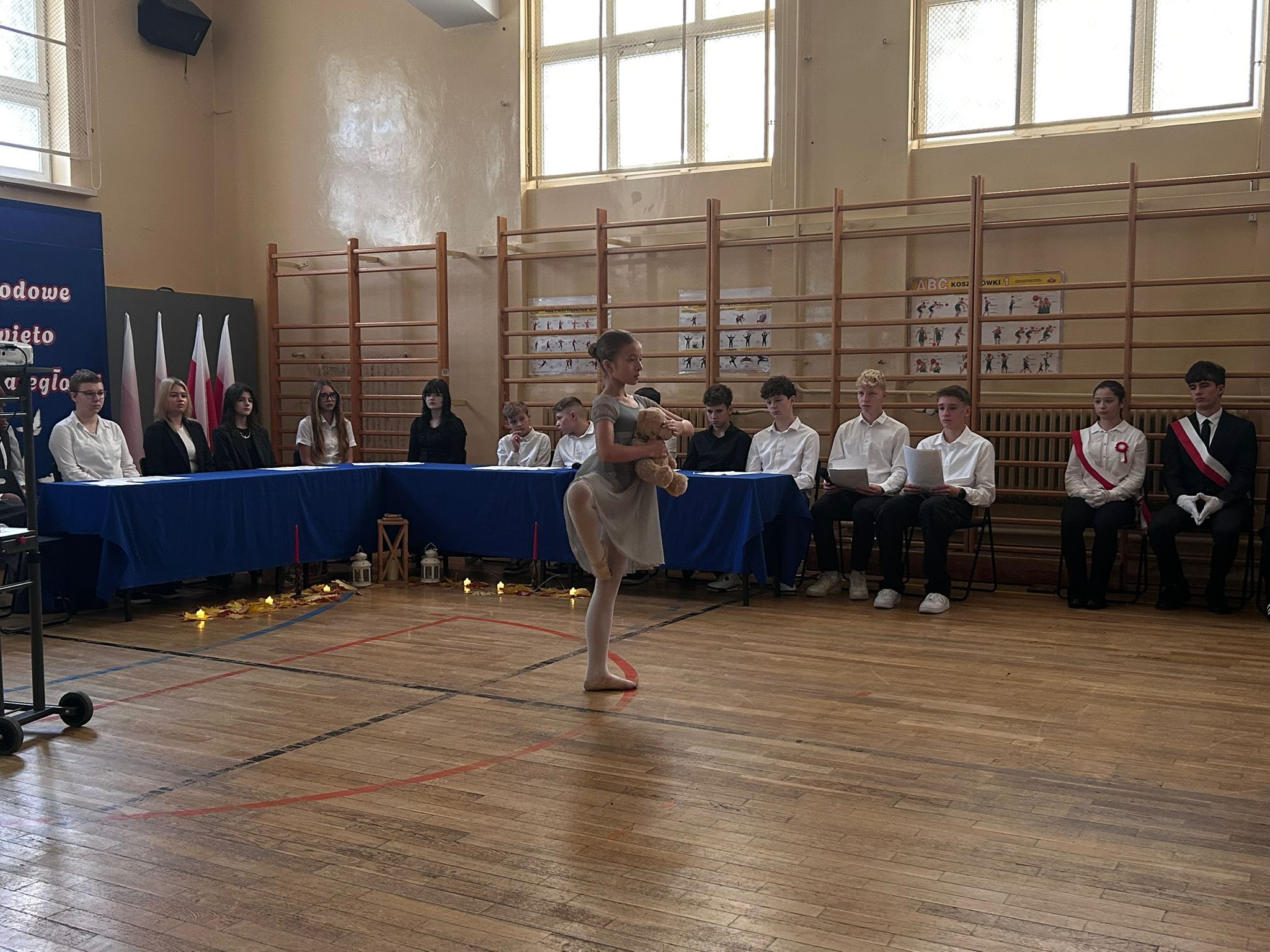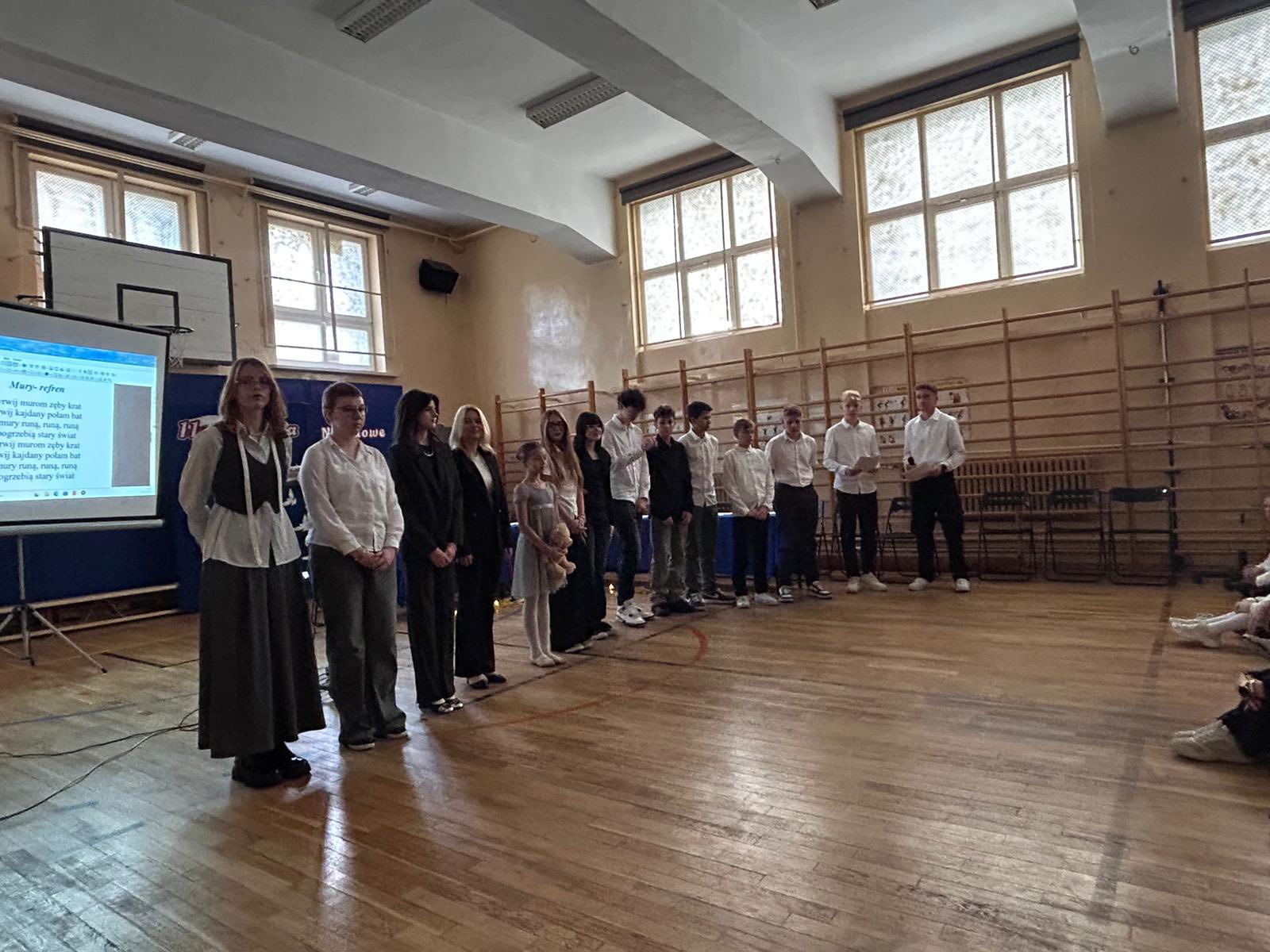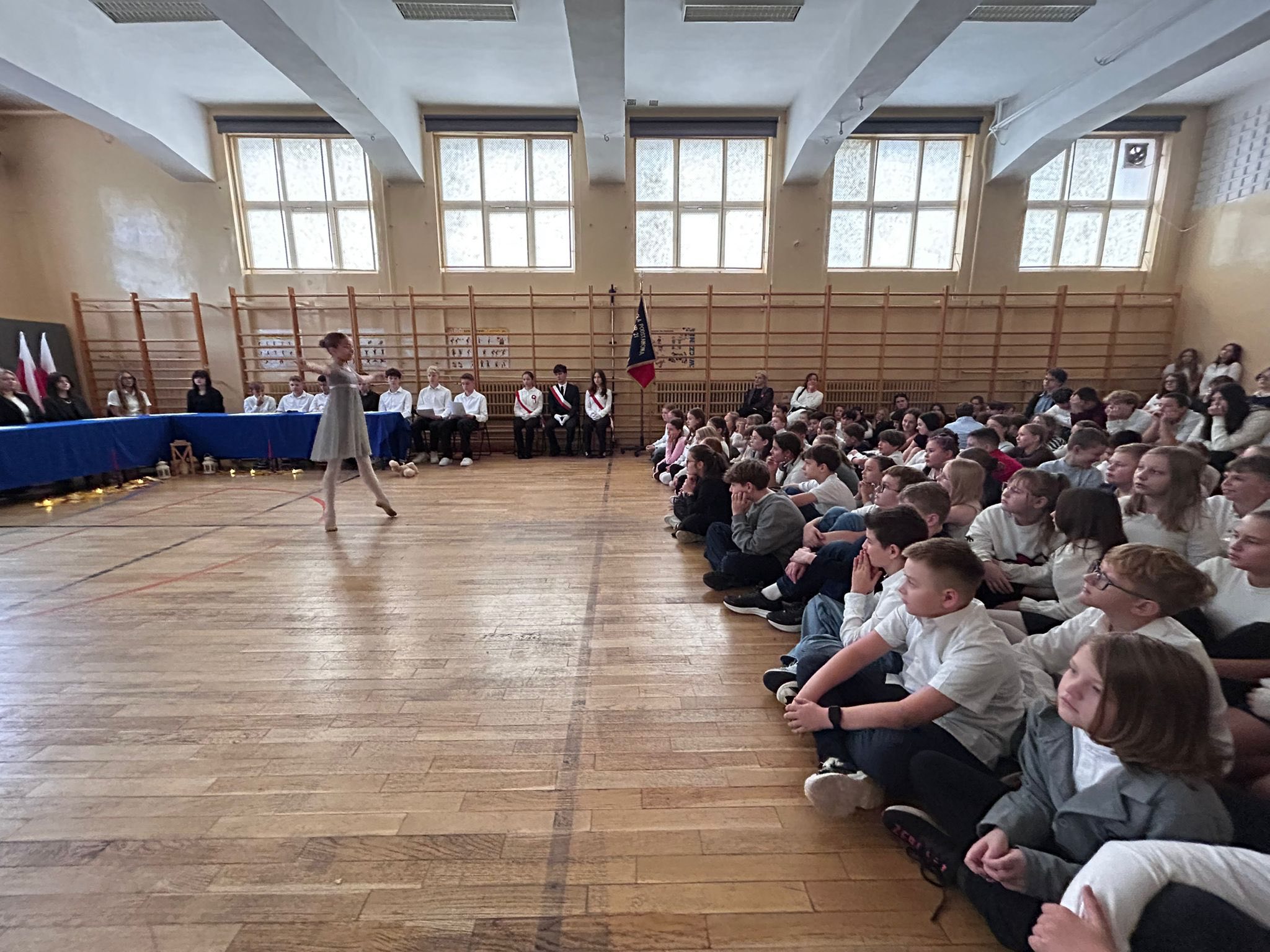 Następnie uczniowie klasy 8b recytowali patriotyczną poezję, a pomiędzy recytacjami wszyscy śpiewali pieśni z różnych okresów historycznych – od bitwy pod Grunwaldem, przez czasy zaborów,powstań narodowych, aż do lat ” Solidarności „. Występ uświetnił wspaniały taniec uczennicy klasy 5a,która przy piosence ” Białe róże ” opowiedziała nam piękna i smutną historię.