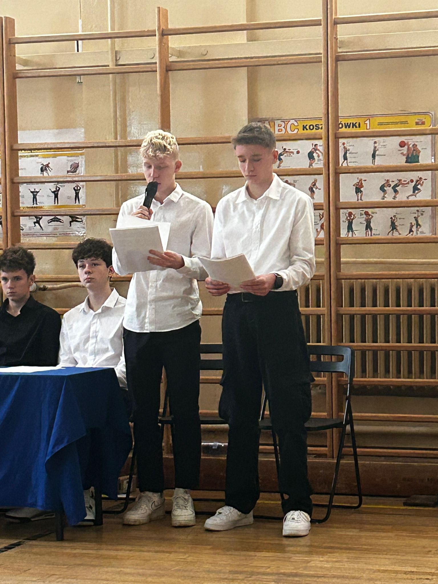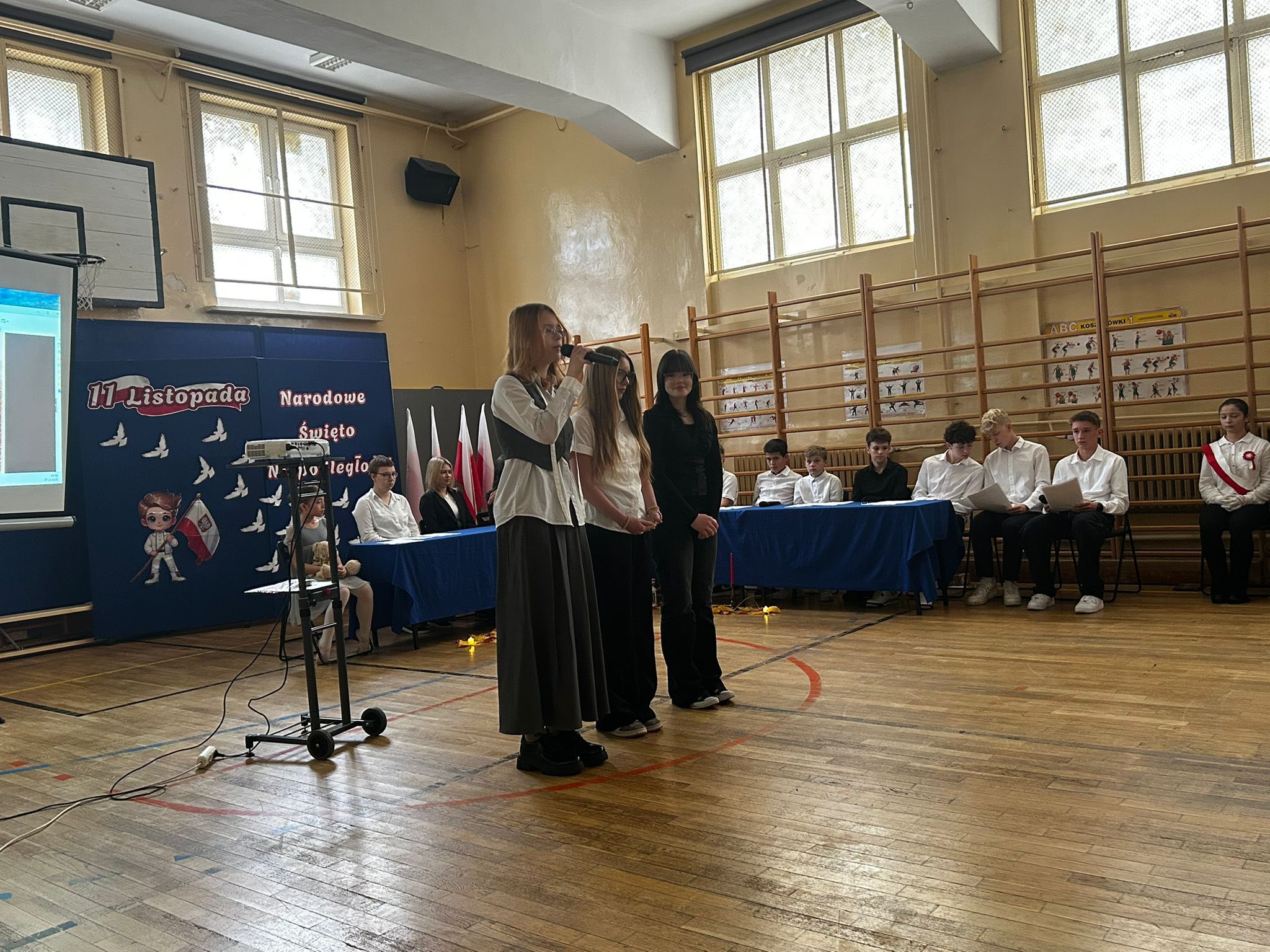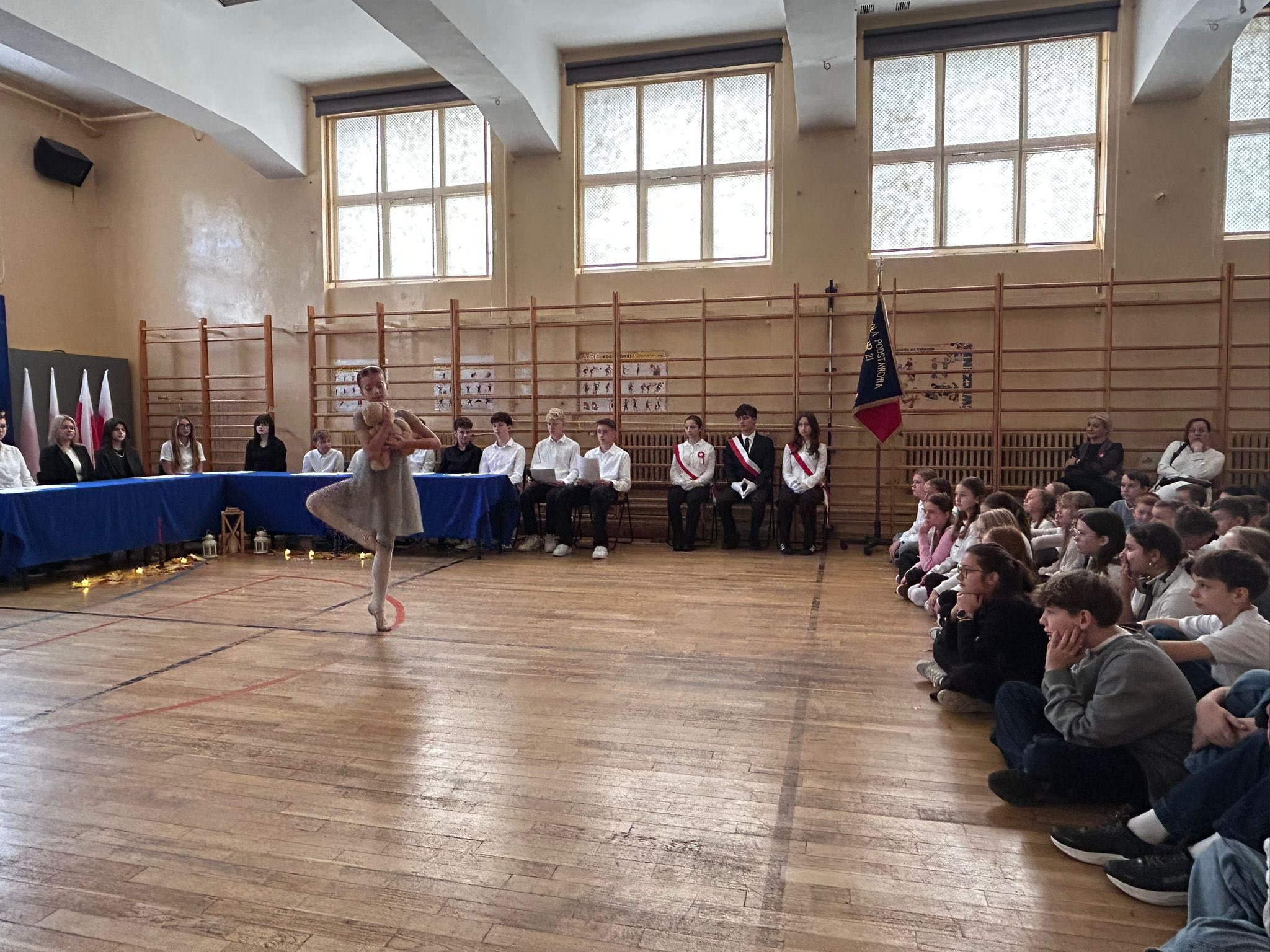Następnie uczniowie klasy 8b recytowali patriotyczną poezję, a pomiędzy recytacjami wszyscy śpiewali pieśni z różnych okresów historycznych – od bitwy pod Grunwaldem, przez czasy zaborów,powstań narodowych, aż do lat ” Solidarności „. Występ uświetnił wspaniały taniec uczennicy klasy 5a,która przy piosence ” Białe róże ” opowiedziała nam piękna i smutną historię.