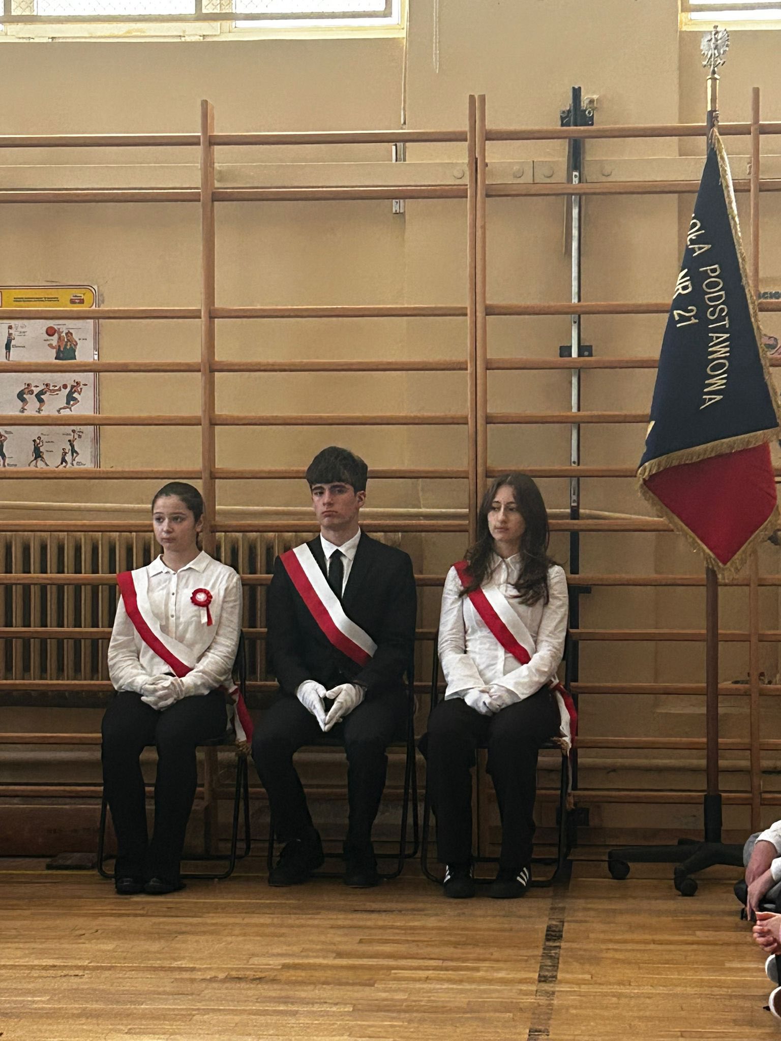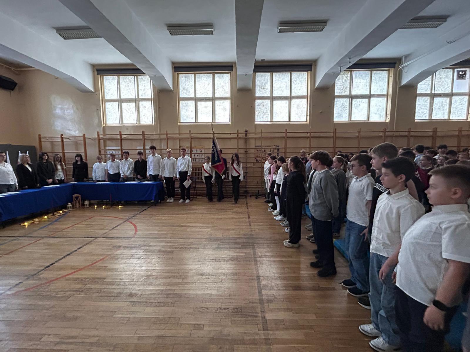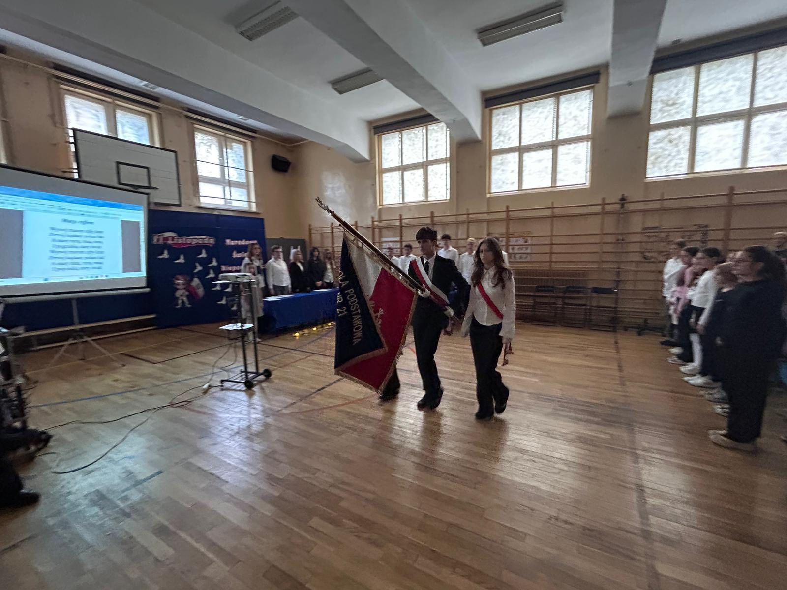 Uroczystość rozpoczęła się od wprowadzenia sztandaru szkoły i wspólnego odśpiewania hymnu narodowego- ” Mazurka Dąbrowskiego”, gdyż bierzemy udział w corocznej akcji pod patronatem MEN ” Szkoła do hymnu”.