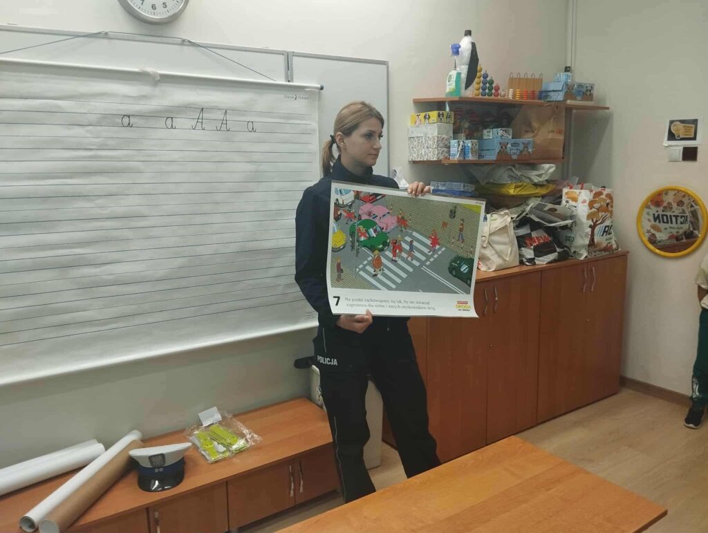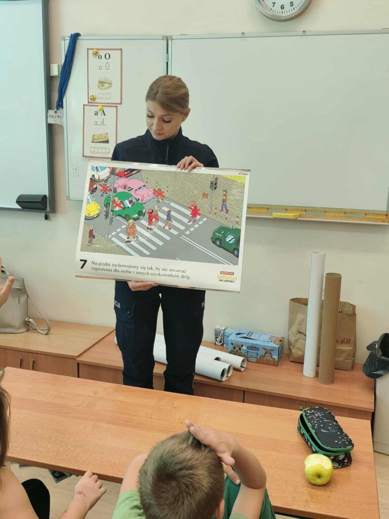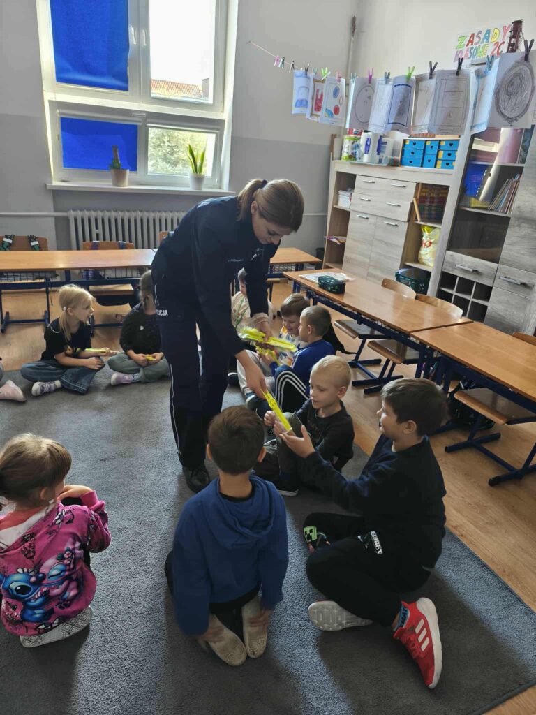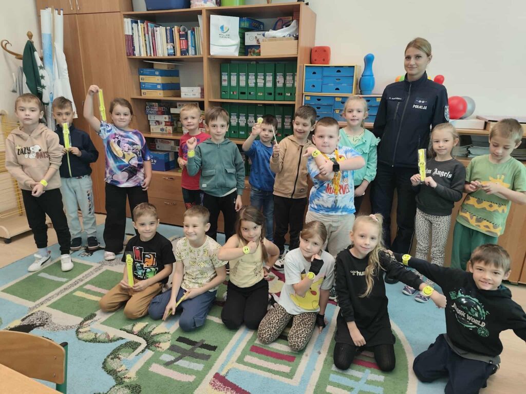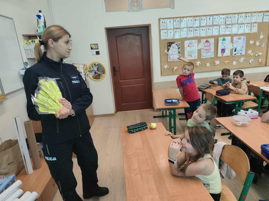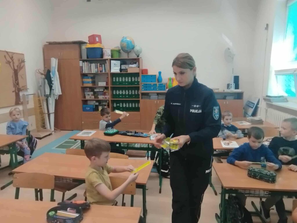 Tematem spotkania było utrwalenie z dziećmi podstawowych zasad zachowania bezpieczeństwa na drodze. Pani Policjantka przypomniała dzieciom jak prawidłowo przechodzić przez jezdnię oraz jak poruszać się bezpiecznie na poboczu, szczególnie o zmroku. Pierwszaki usłyszały również jak zachować się w kontaktach z nieznajomymi oraz do kogo zwracać się o pomoc w sytuacji zagrożenia, przypominały numery alarmowe. Każdy uczeń dostał opaskę odblaskową.