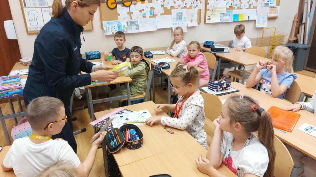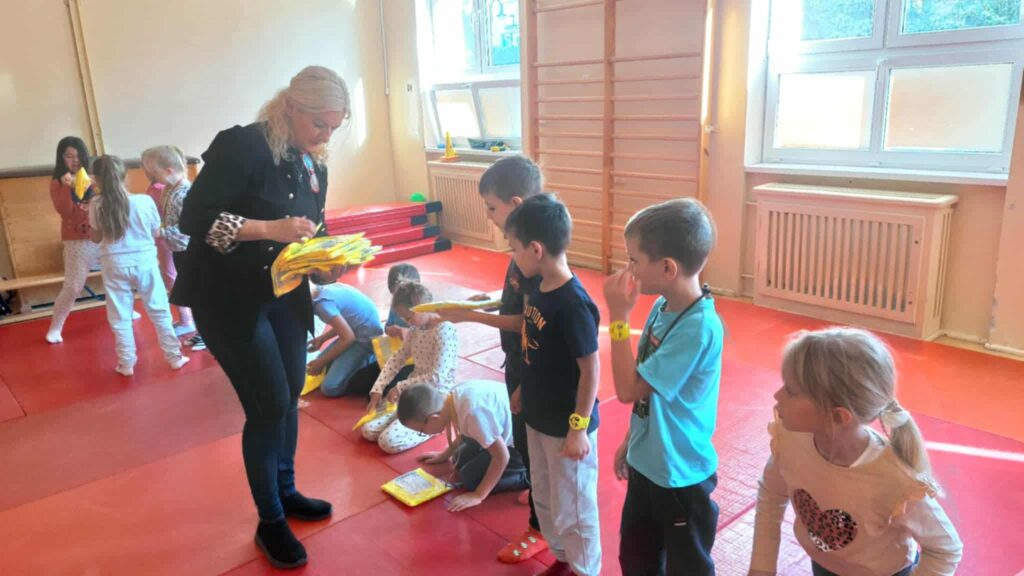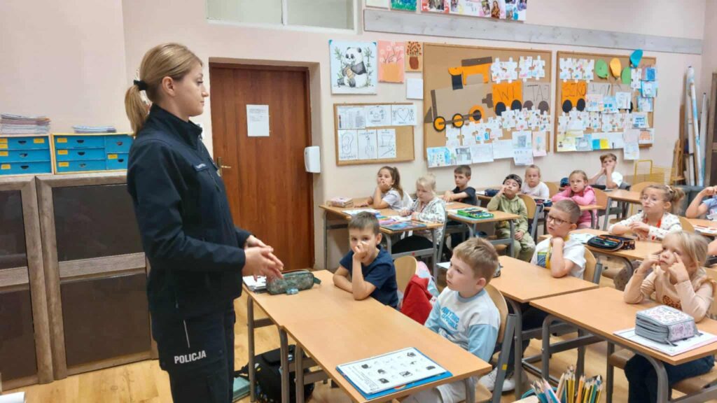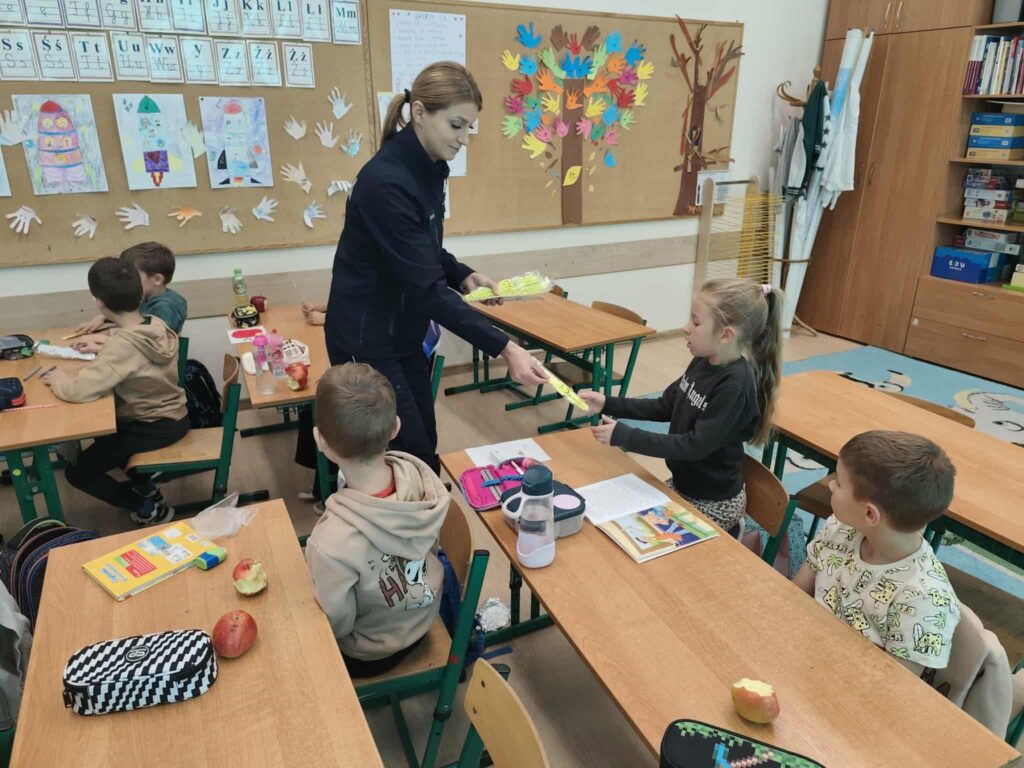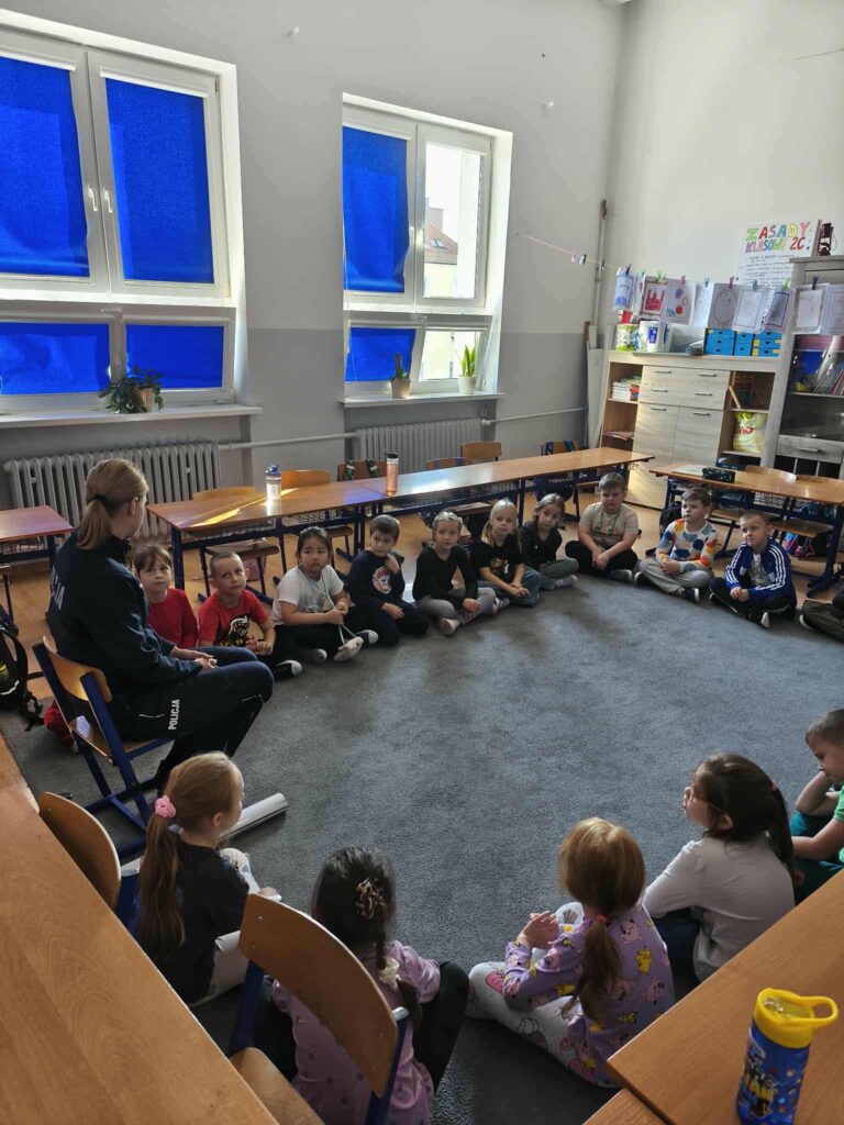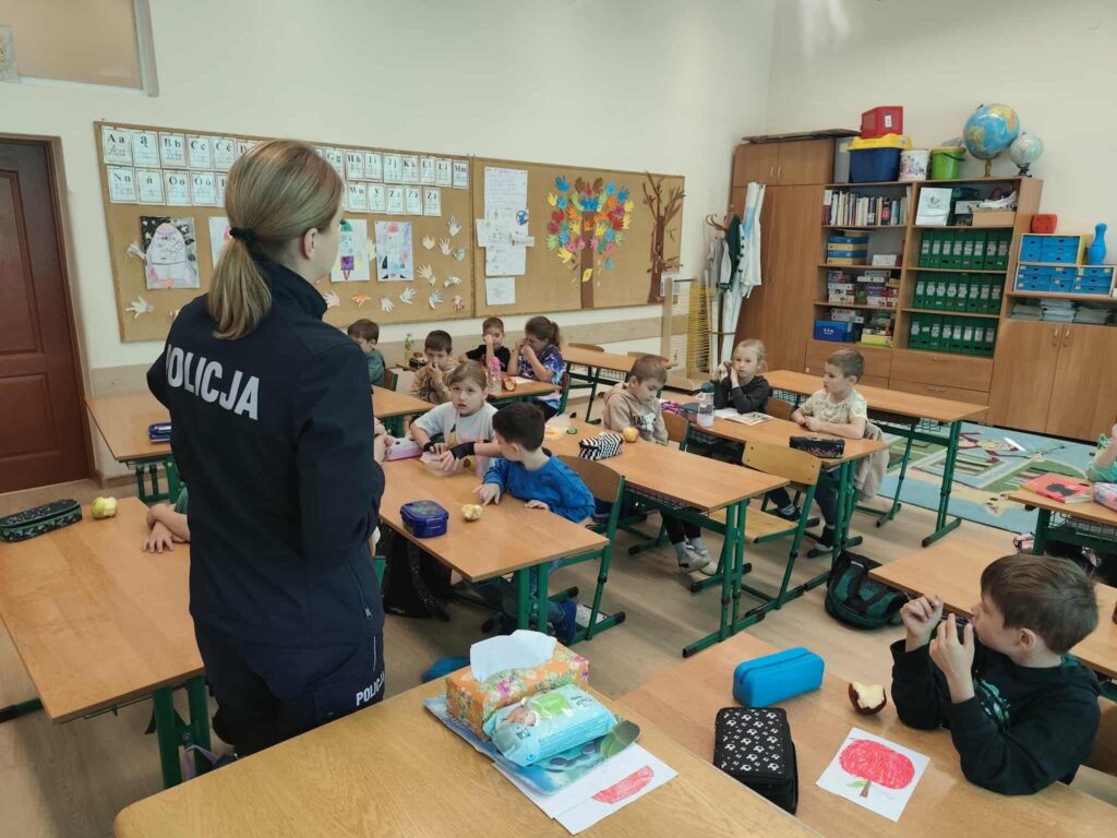 Tematem spotkania było utrwalenie z dziećmi podstawowych zasad zachowania bezpieczeństwa na drodze. Pani Policjantka przypomniała dzieciom jak prawidłowo przechodzić przez jezdnię oraz jak poruszać się bezpiecznie na poboczu, szczególnie o zmroku. Pierwszaki usłyszały również jak zachować się w kontaktach z nieznajomymi oraz do kogo zwracać się o pomoc w sytuacji zagrożenia, przypominały numery alarmowe. Każdy uczeń dostał opaskę odblaskową.