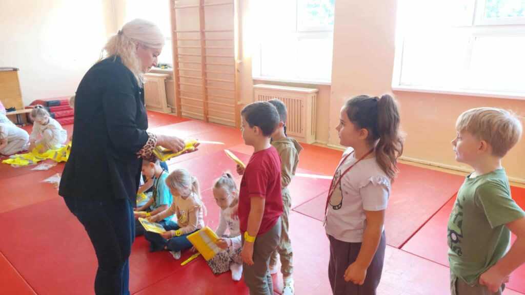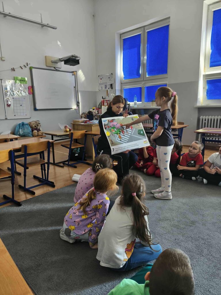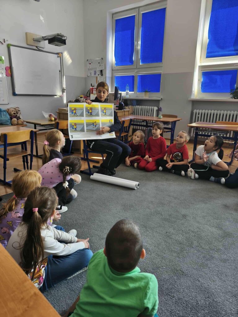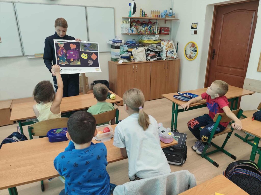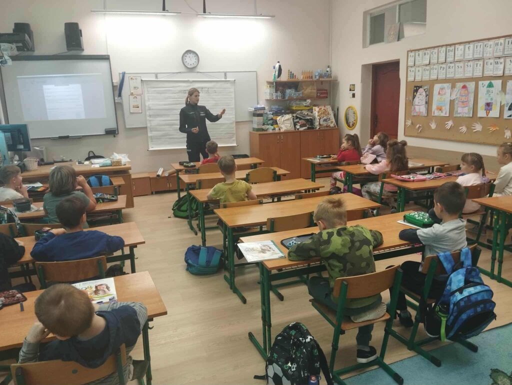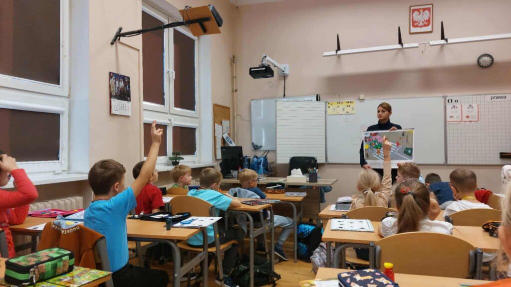 Tematem spotkania było utrwalenie z dziećmi podstawowych zasad zachowania bezpieczeństwa na drodze. Pani Policjantka przypomniała dzieciom jak prawidłowo przechodzić przez jezdnię oraz jak poruszać się bezpiecznie na poboczu, szczególnie o zmroku. Pierwszaki usłyszały również jak zachować się w kontaktach z nieznajomymi oraz do kogo zwracać się o pomoc w sytuacji zagrożenia, przypominały numery alarmowe. Każdy uczeń dostał opaskę odblaskową.